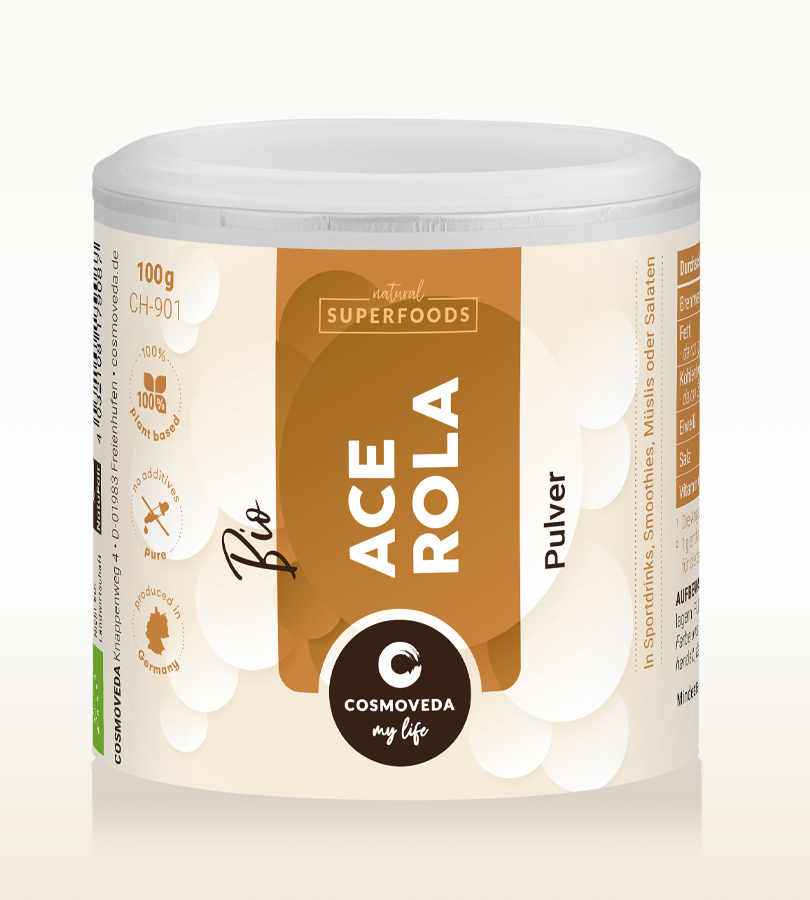 SUPERFOODS: Acerola gehört zu den sogenannten Superfoods. Sie sind eine wertvolle Bereicherung einer ausgewogenen und abwechslungsreichen Ernährung und lassen sich ganz vielfältig und kreativ verwenden – in Joghurts, Shakes, Smoothies, Müslis, Bowls, Salaten oder Sportdrinks.