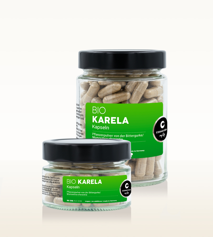 Karela - Momordica charantia - ist eine als Bittergurke bekannte einjährige Kletterpflanze mit handförmigen, fünflappigen Blättern aus deren gelben Blüten sich gurkenähliche, genoppte, leicht gebogene Früchte entwickeln, die anfangs grün sind und in der Reife orangegelb werden. In der ayurvedischen Ernährung werden die Früchte, Samen und Blätter verwendet. Das in unserer Produktion fein und schonend (unter 40°C) vermahlene Pulver aus den Früchten stammt aus unseren Indischen und Srilankesischen Fair Trade und Bio Projekten.