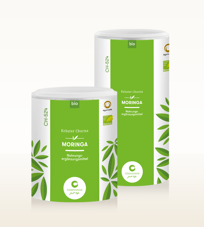 Moringa - Moringa oleifera - ist in Europa auch unter dem Namen „Meerrettichbaum“ bekannt und stammt ursprünglich aus der Himalaya-Region in Nordwestindien. Im Ayurveda werden die Blätter der Pflanze verwendet. Das in unserer Produktion fein und schonend (unter 40°C) vermahlene Pulver aus den Blättern stammt aus unseren Indischen und Srilankesischen Fair Trade und Bio Projekten.